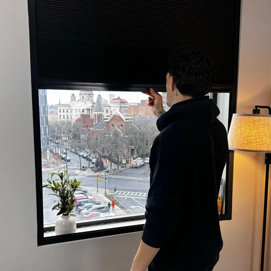 The shades are made from high-quality, durable fabric with honeycomb technology, supported by a lightweight aluminum frame. The fabric is designed to enhance blackout capabilities and provide excellent insulation, while the aluminum frame adds a sleek and sturdy finish keeping your blinds lightweight.