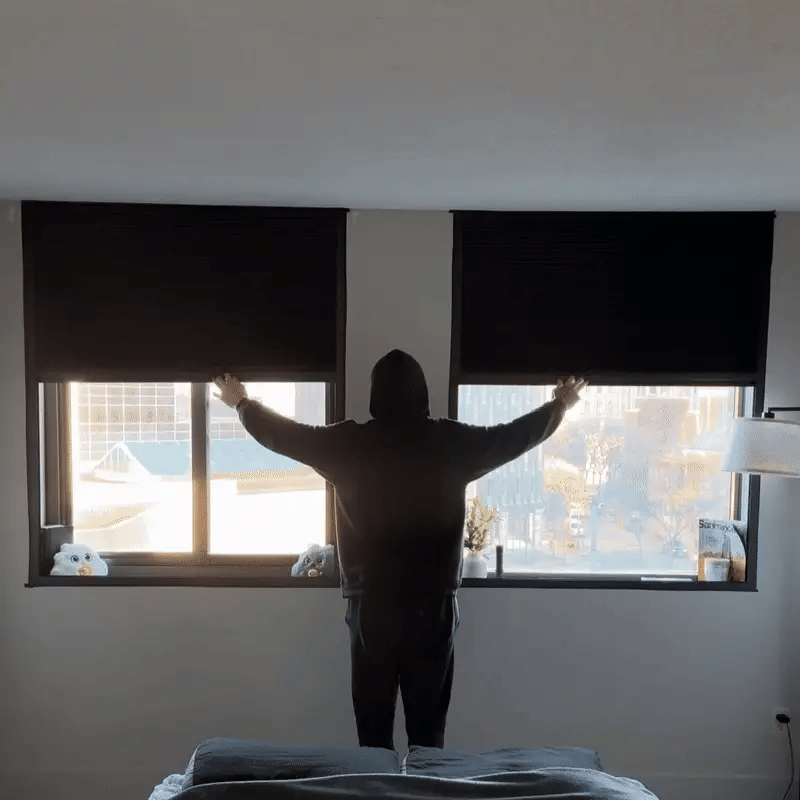 When sunlight and street-lamp glare sneak into your bedroom, it not only wakes you up, it makes you stressed, puts you in a bad mood, and leaves you tired all day. Our no-drill blackout shades block all outside light so you sleep soundly and wake up refreshed.